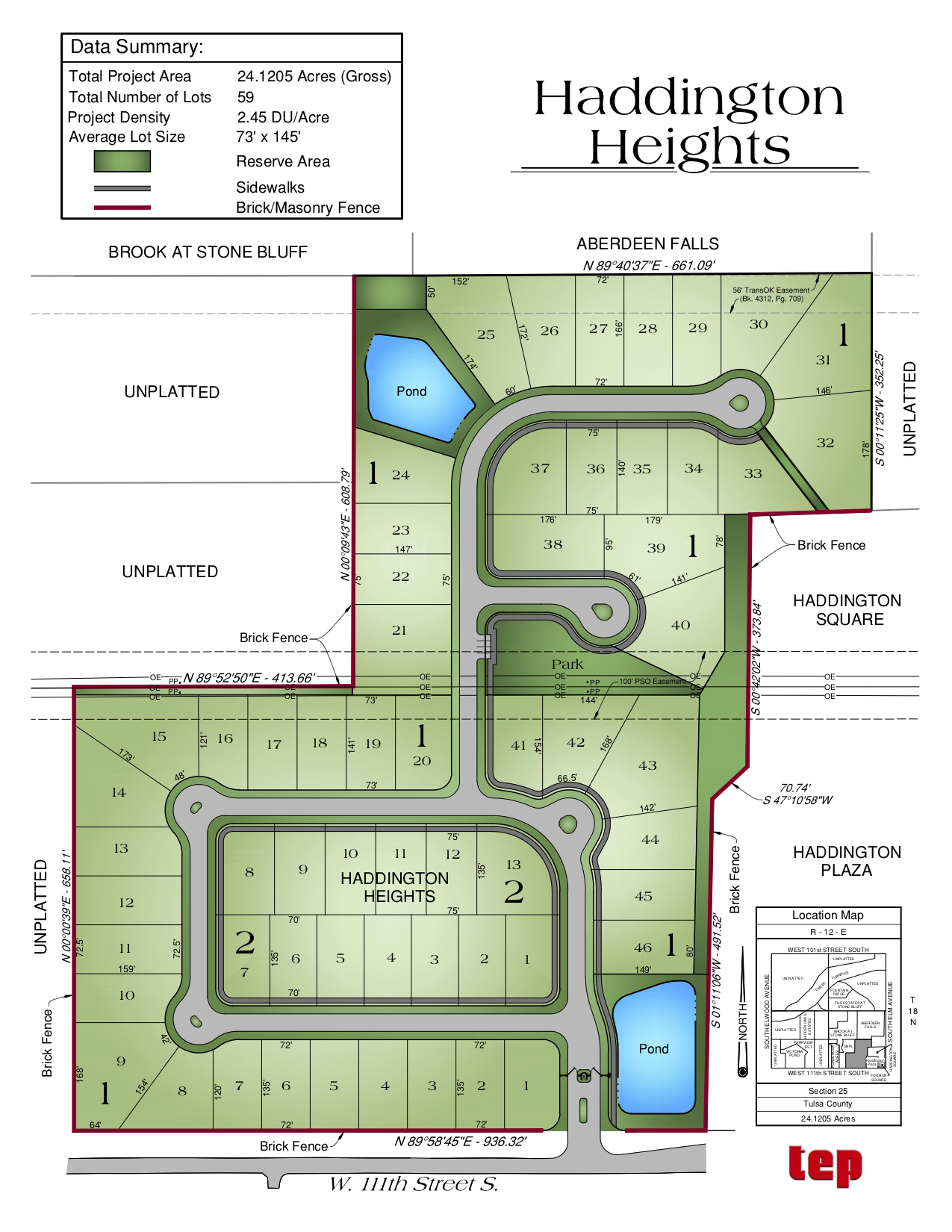 Haddington is designed for luxury homes with privacy gates and a full masonry wall surrounding the development. There are two ponds with fountains and a very large neighborhood park. The Tulsa County Trail system can be accessed less than 200 yards from the neighborhood gates. Haddington is conveniently located just 2 miles east of Highway 75, and 1 mile south of the Creek Turnpike, and only minutes to the Riverwalk Crossing on the Arkansas River.